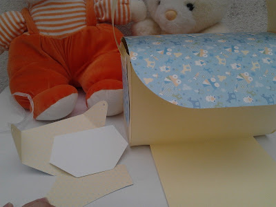 Fiz então um saquinho de maternidade em tons de amarelo e azul e coloquei dentro um postalinho fralda para a mensagem.